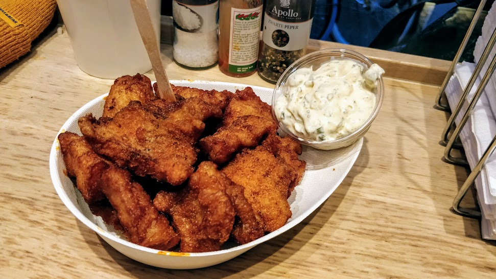 The first thing I wanted to try was Kibbeling. This popular street food snack is common as a lunchtime treat for the locals, and as it is quick and easy to sit down and try a plate. I was recommended to find a small corner shop that sold fresh seafood dishes, and here I found fresh kibbeling amongst another Dutch delicacy – pickled raw herring.